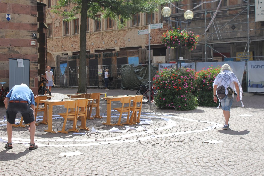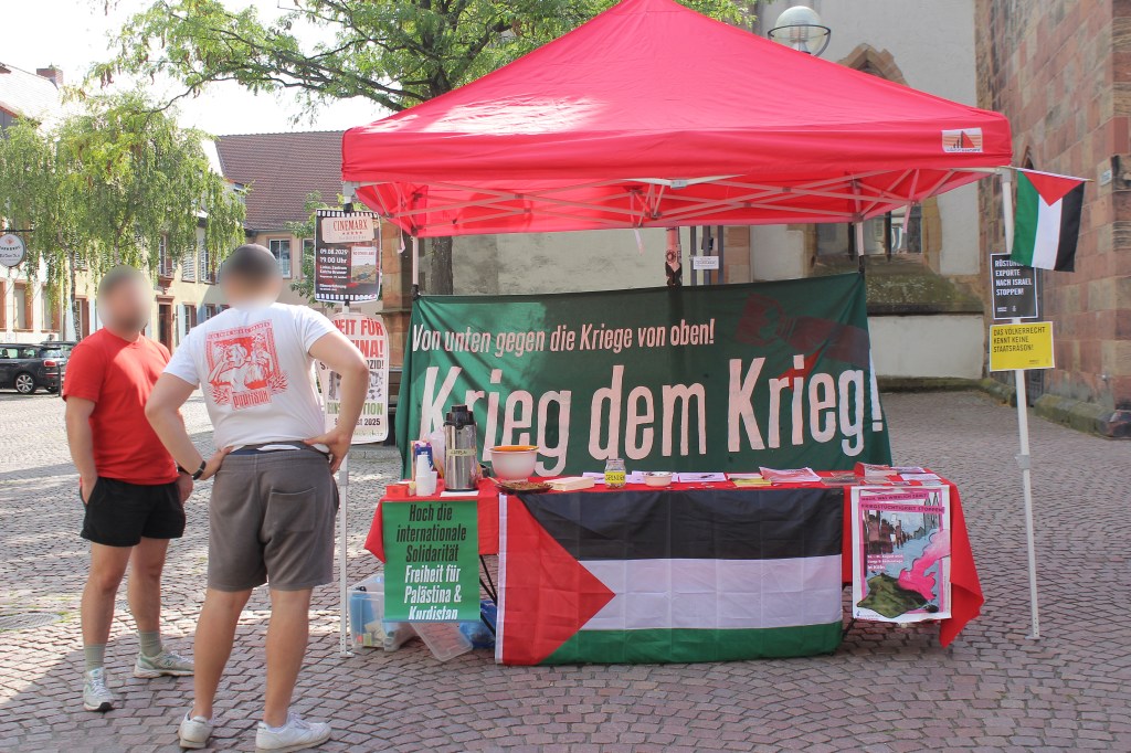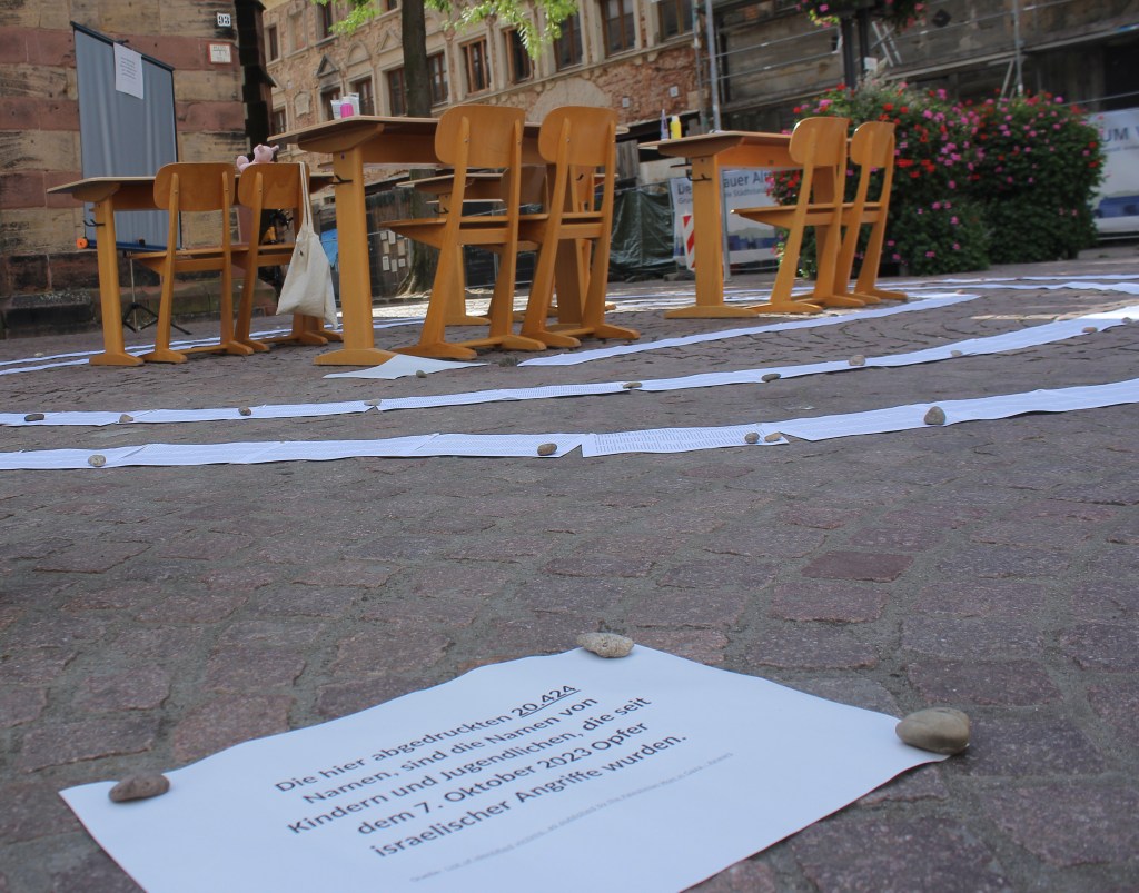 Samstag, der 09.08., stand für uns ganz im Zeichen der Palästinasolidarität. Begonnen hatte der Aktionstag bereits am Morgen auf dem Stiftsplatz, wo wir mit einem Infostand vertreten waren. Unser Ziel: Mit Menschen ins Gespräch kommen, Aufmerksamkeit schaffen und unsere Solidarität mit den Menschen in Palästina im Angesicht von Krieg, Vertreibung und Besatzung auszudrücken. Neben verschiedenem Infomaterial hatten wir einen Aufsteller vorbereitet, der den Blick auf Widerstandsformen aus aller Welt gegen den Krieg Israels richten sollte – von Hafenblockaden in Durban, Südafrika über Unibesetzungen in New York bis hin zur Sabotage von Waffen in England. Ergänzt wurde der Infostand durch eine Kunstaktion: Ein leeres Klassenzimmer erinnerte an ca. 20.000 ermordete Kinder und verdeutlichte das besondere Leid der im Durchschnitt sehr jungen Bevölkerung in Gaza.