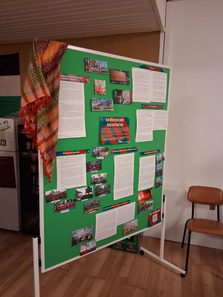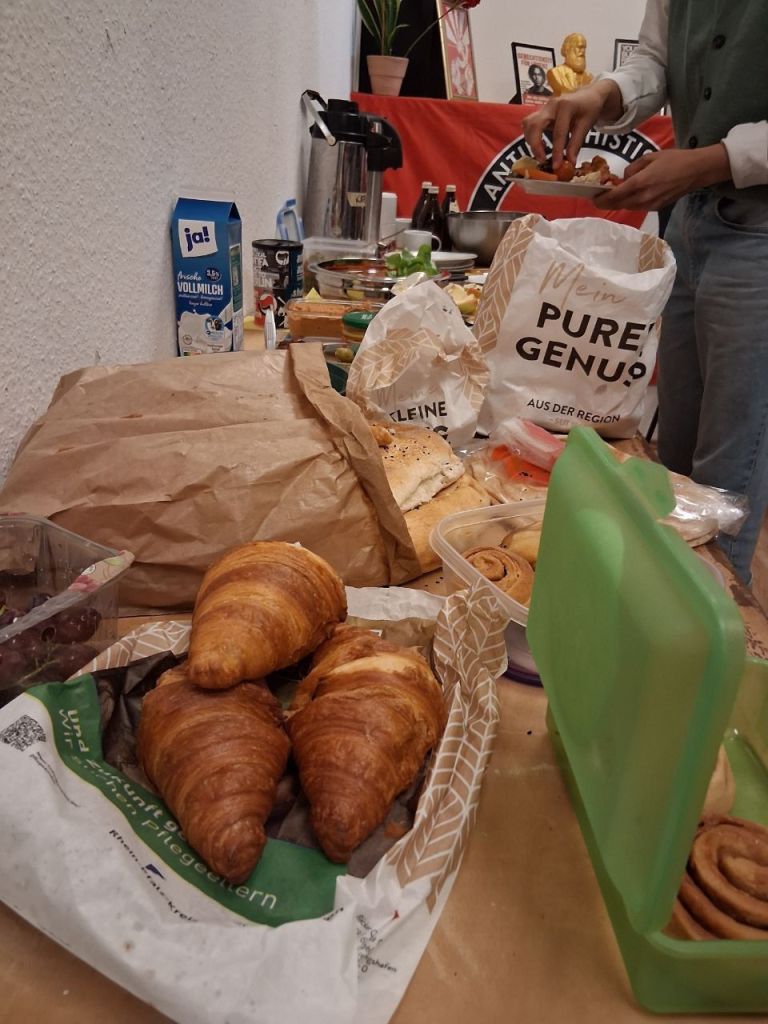 Ein gut gefülltes Linkes Zentrum heute beim Brunch der AG Palästinasolidarität: Viele Aktivist:innen tauschten sich über Krieg, Militarisierung und den Genozid in Gaza aus. Die Anwesenden sind sich einig, dass der Kampf für ein freies Palästina nicht mit einem vermeintlichen „Friedensplan“ endet und dass der Kampf gegen Krieg und Militarisierung hier in Deutschland eine zentrale Aufgabe unserer Bewegung in den kommenden Jahren wird. Achtet in Zukunft also auf Ankündigungen und werdet aktiv gegen die Kriege der Herrschenden!