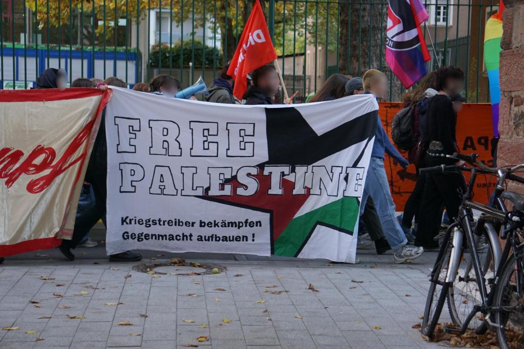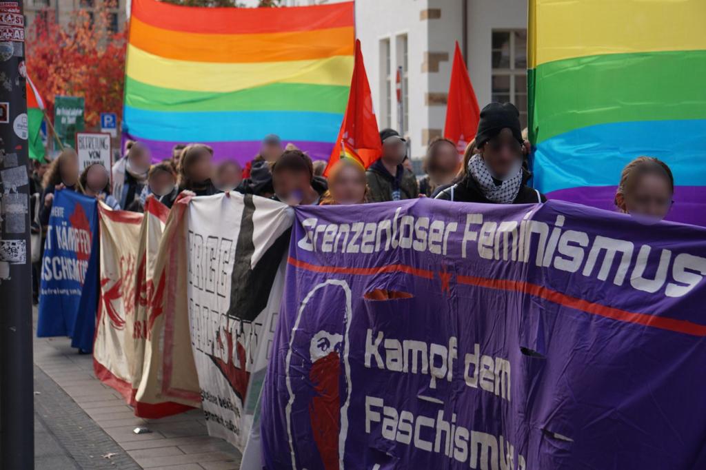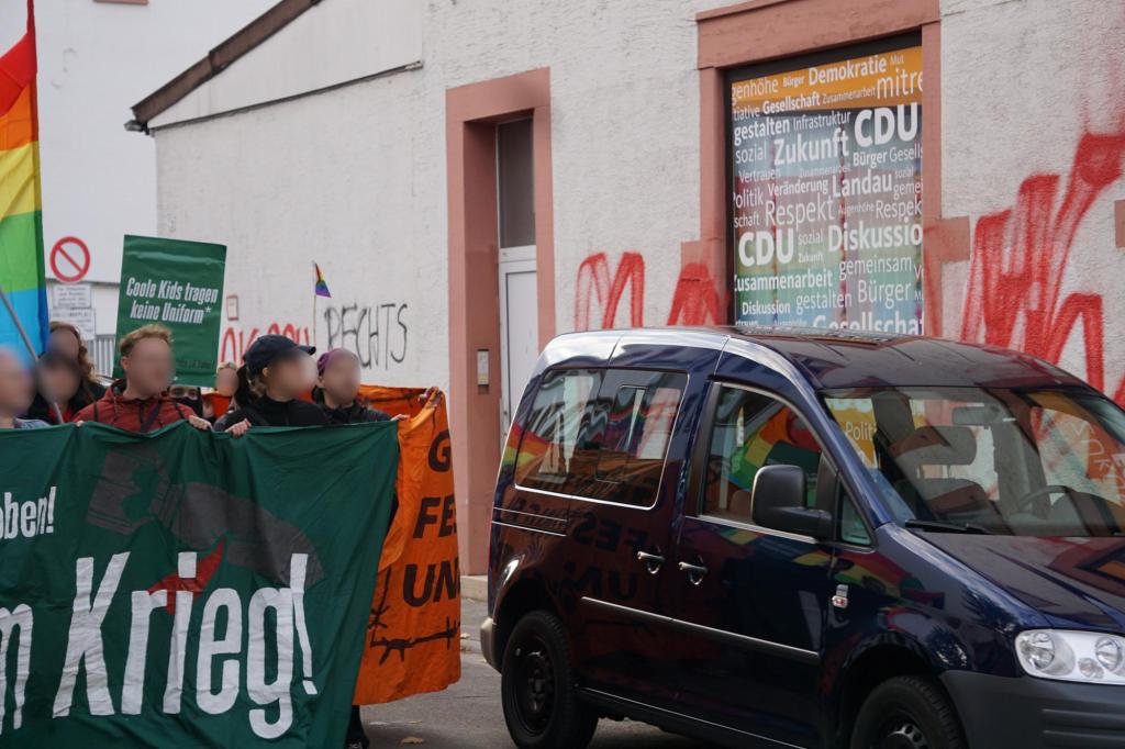 Hinter einer „Krieg dem Krieg“-Botschaft sammelte sich im Anschluss an die Kundgebung noch eine spontane, unangemeldete Demonstration, die 20 Minuten durch die Landauer Innenstadt hin zur Jugendstilfesthalle zog. Durch lautstarke Parolen, viele Fahnen und Transparente wurde nochmal ein deutliches Zeichen gegen den Besuch von Klöckner gesetzt und die Landauer:innen aufgerufen, sich gegen Rechtsruck, Sozialabbau und Kriegstreiberei einzusetzen. An der Festhalle angekommen endete unsere Demonstration bei einer zeitgleich stattfindenden bürgerlichen Kundgebung, an der sich auch die Grünen und Volt beteiligten. Dass wir bürgerliche Parteien, die den aktuellen Kurs weitestgehend – mittlerweile ganz ohne Bauchschmerzen – mittragen, als die falschen Partner im Kampf gegen die Probleme unserer Zeit betrachten, haben wir an diesem Tag bereits auf unserer Kundgebung deutlich gemacht.