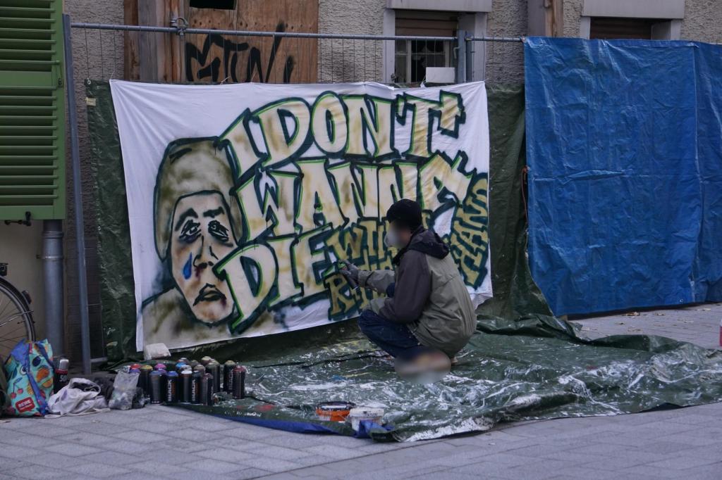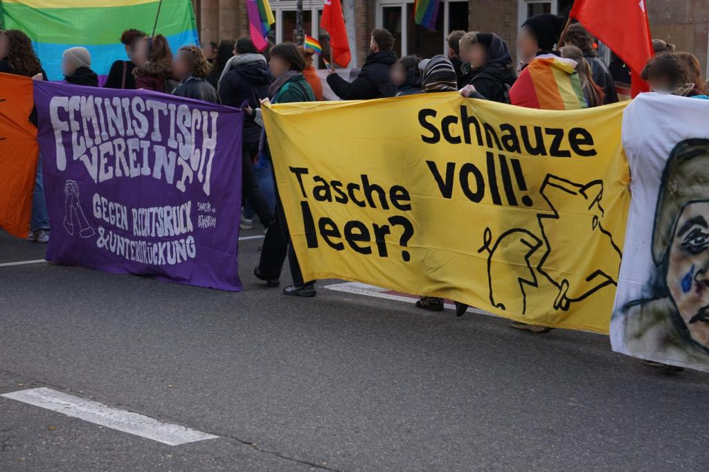 An der Kundgebung beteiligten sich knapp 200 Menschen und versammelten sich in der Waffenstraße hinter dem Rathaus. Das Rathaus steht in diesem Kontext sinnbildlich für einen Ort, an dem Sparprogramme zur Militarisierung der Bevölkerung durchgesetzt werden sollen, an dem ihnen aber auch Widerstand entgegengebracht werden kann. In Reden wurden die Kürzungspläne der Regierung, die Kriegsvorbereitungen der Herrschenden, der zunehmende Abbau der Rechte von Frauen und Queers und die rassistische Abschottungspolitik gepaart mit rechter Gewalt auf den Straßen thematisiert. Deutlich wurde dabei, dass wir als Linke und Beschäftigte diejenigen sind, die diesem Treiben Steine in den Weg werfen können, wenn wir unsere Kämpfe zusammen und konsequent führen. Parallel zur Kundgebung wurden aus einem Bauchladen Flugblätter zum Anlass der Demonstration und der beteiligten Organisationen an Passant:innen verteilt und ein antimilitaristisches Transparent gesprüht, das direkt Verwendung fand.