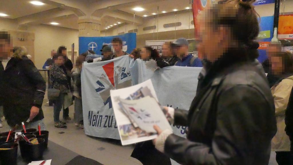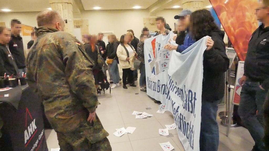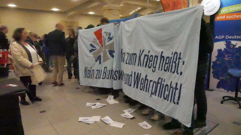 Wir haben den Stand der Bundeswehr einem Transparent mit der Aufschrift „Nein zum Krieg heißt: Nein zu Bundeswehr und Wehrpflicht!“ abgeschirmt. Dabei wurde eine starke inhaltliche Durchsage gemacht und Flyer verteilt. Auch wurden einige Anti-Bundeswehr Plakate auf der Messe plaziert. Mit der Parole „Kein Mensch, kein Cent der Bundeswehr“ sind wir selbstbestimmt gegangen und haben das Infomaterial der Bundeswehr noch ein wenig reduziert.