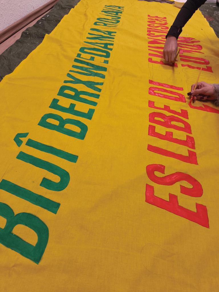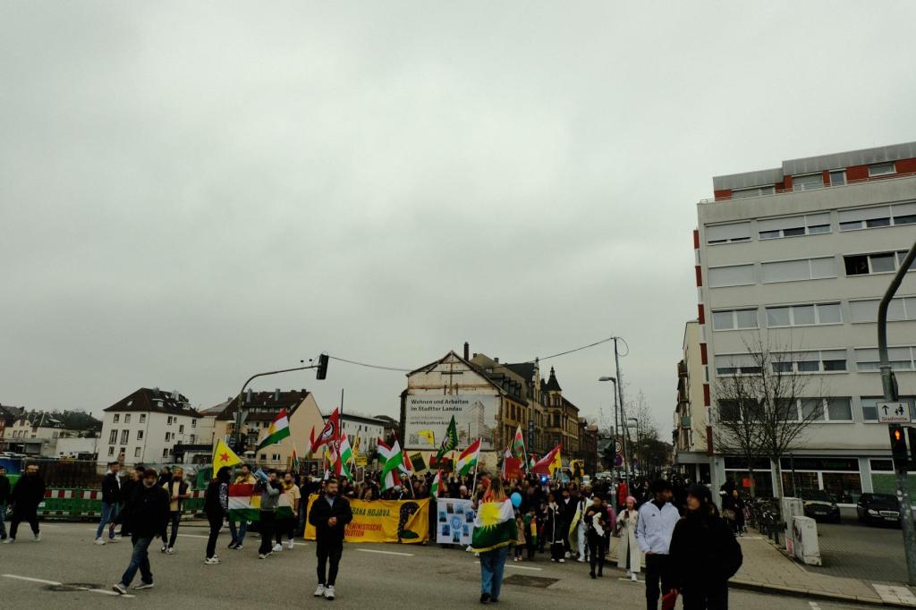 Am Freitag haben wir im Linken Zentrum Kätche Brunner zusammen gebastelt, getanzt und Texte geschrieben. Die Demonstration war vorallem ein Projekt von Frauen. Einige kurdische Frauen und Internationalistinnen mobilisierten 300 Demonstrant:innen, die ein starkes Zeichen für die Verteidigung der Frauenrevolution auf Landaus Straßen trugen.