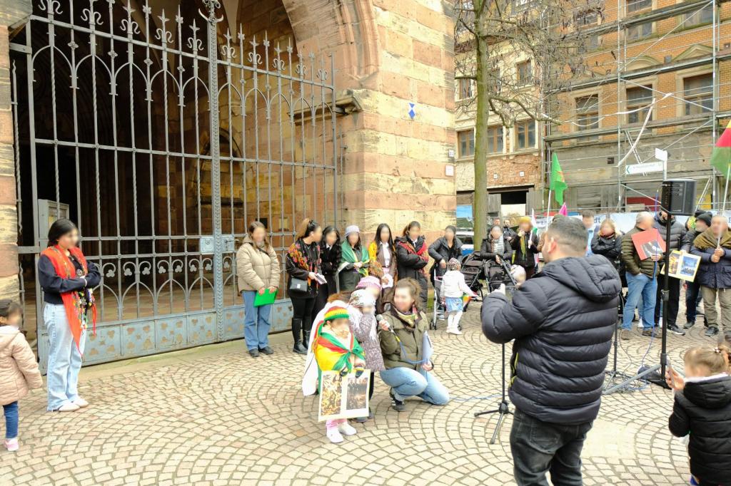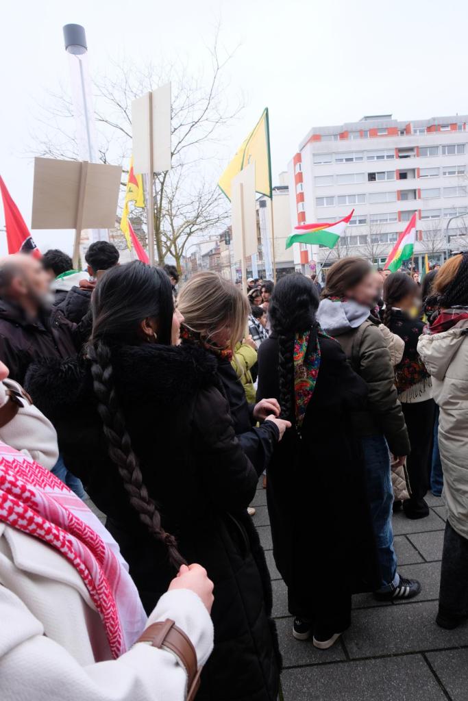 In einigen Redebeiträgen, die sowohl auf deutsch als auch auf kurdisch gehalten wurden, wurde nicht nur die politische Situtaion eingeordnet, die Rolle des deutschen Staates, wieder EU und der USA angeprangert, sondern auch persönliche Geschichte von Menschen erzählt, die Kobanê bereits 2015 verlassen mussten. Heute ist Kobanê wieder umzingelt von seinen Feinden, die Demonstrant:innen machten mit lauten Rufen und eindrucksvollen Reden klar: Das lassen wir nicht zu! Als Zeichen der Solidarität mit den gefallenen Kämperinnen in Rojava haben sich Frauen die Haare geflochten, während das Lied Lori Lori Lorikamin gesungen wurde.